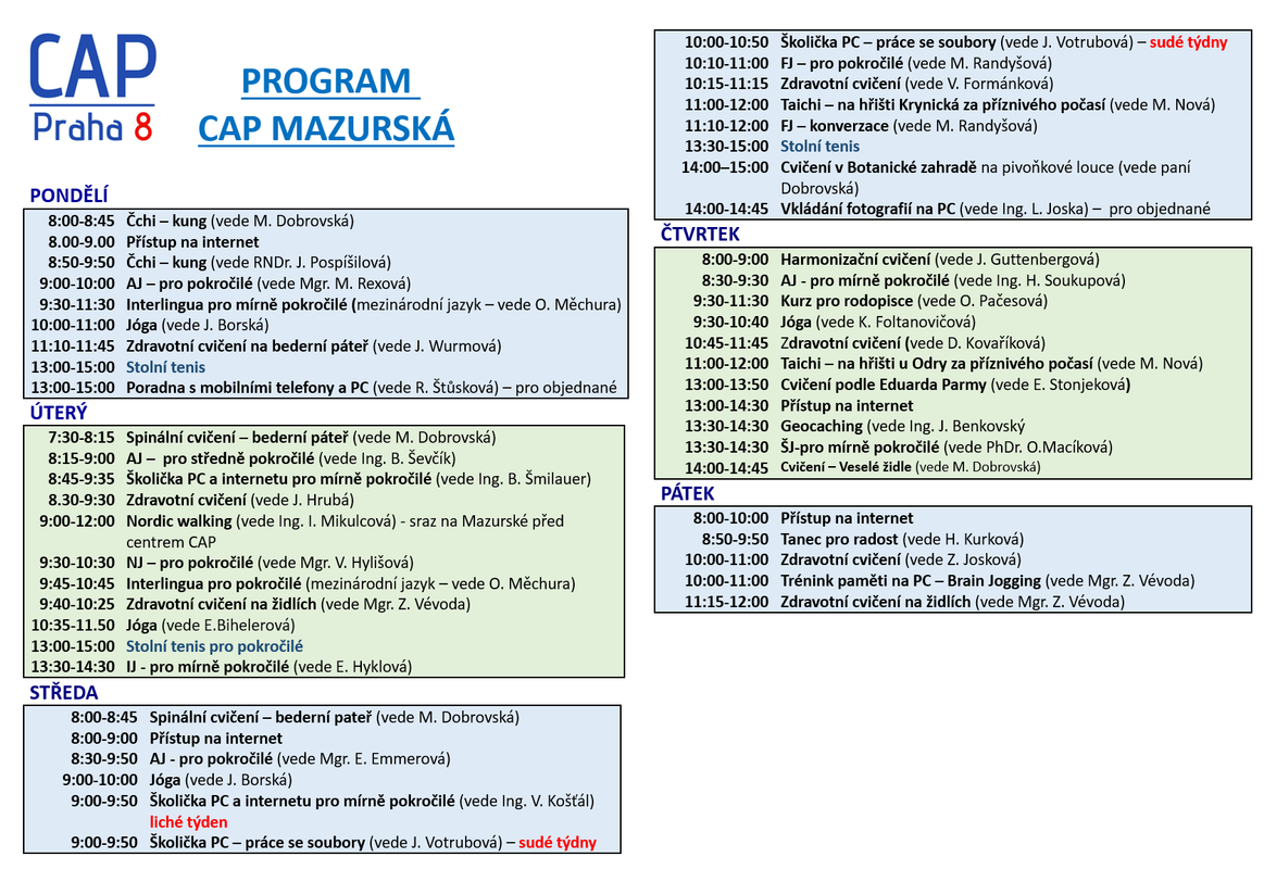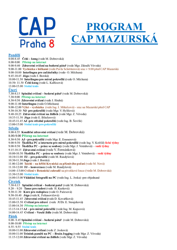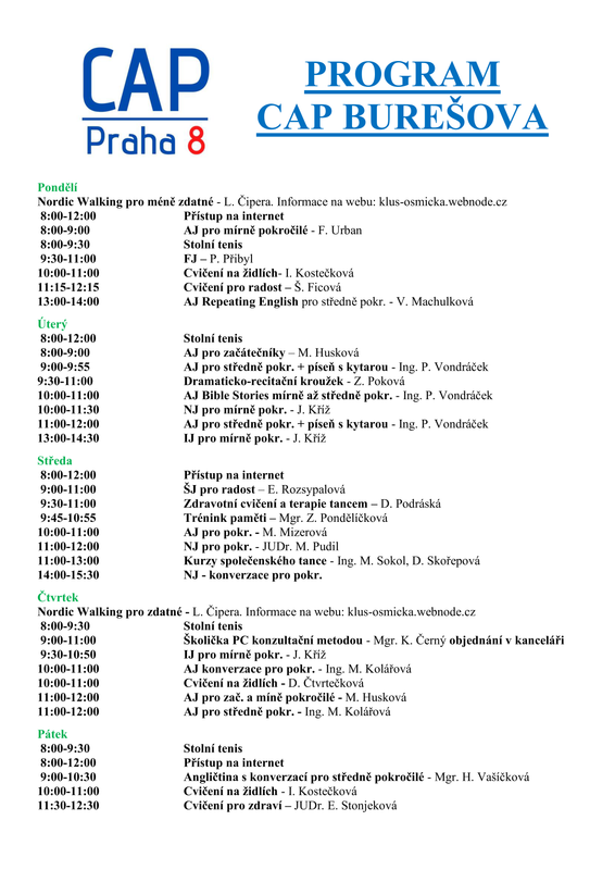 Informace o provozu jednotlivých klubů můžete získat u Petry Limanovské, vedoucí služby CAP Praha 8, tel.: 283 881 848.